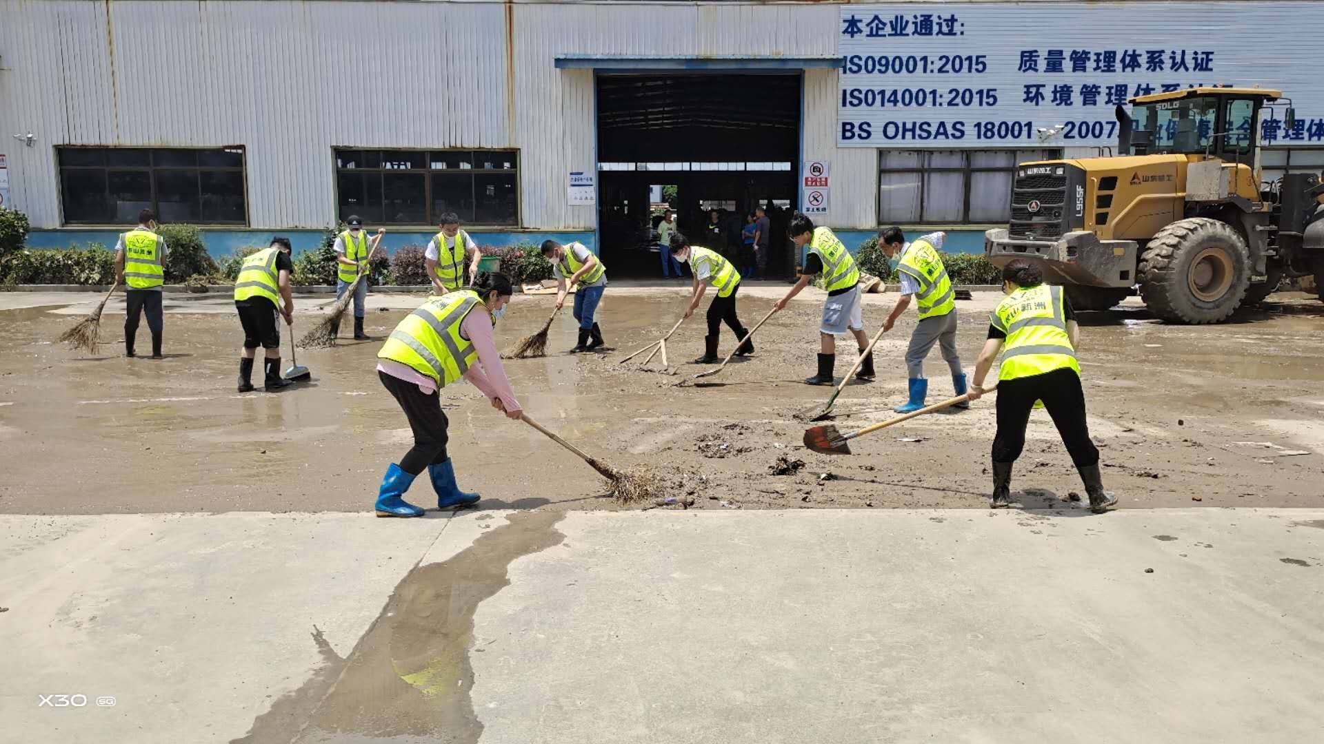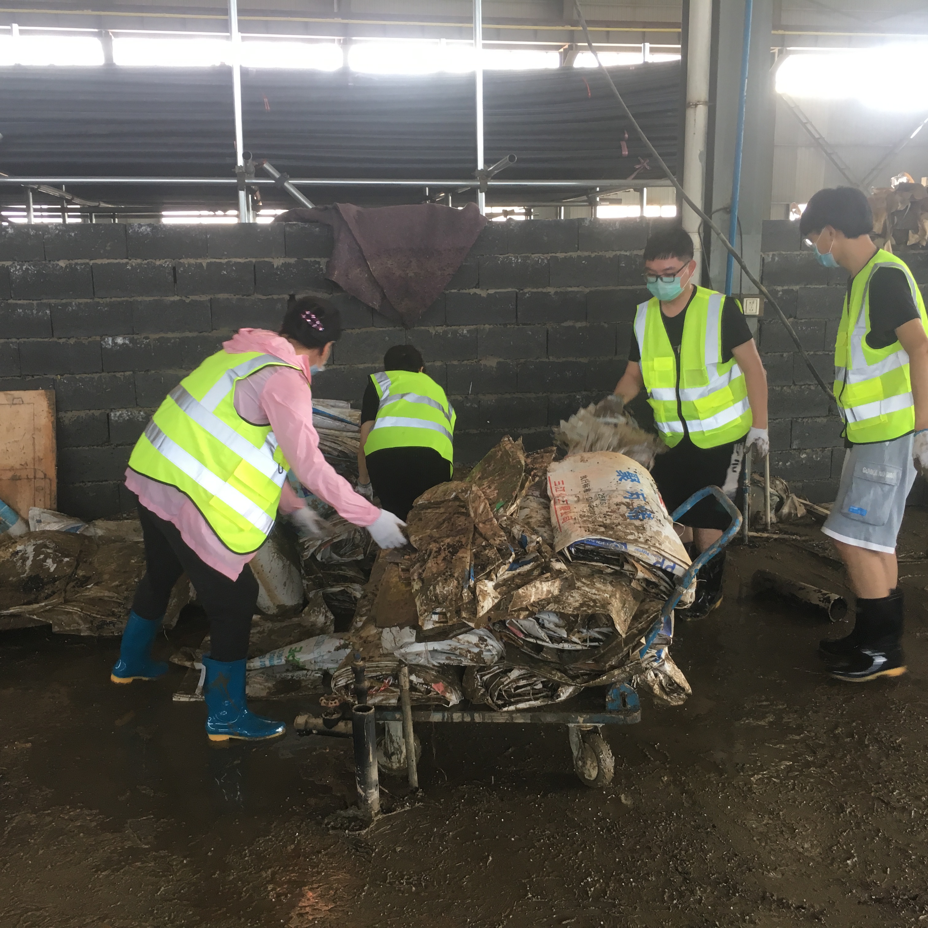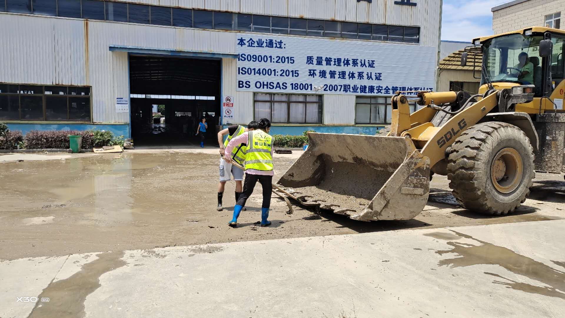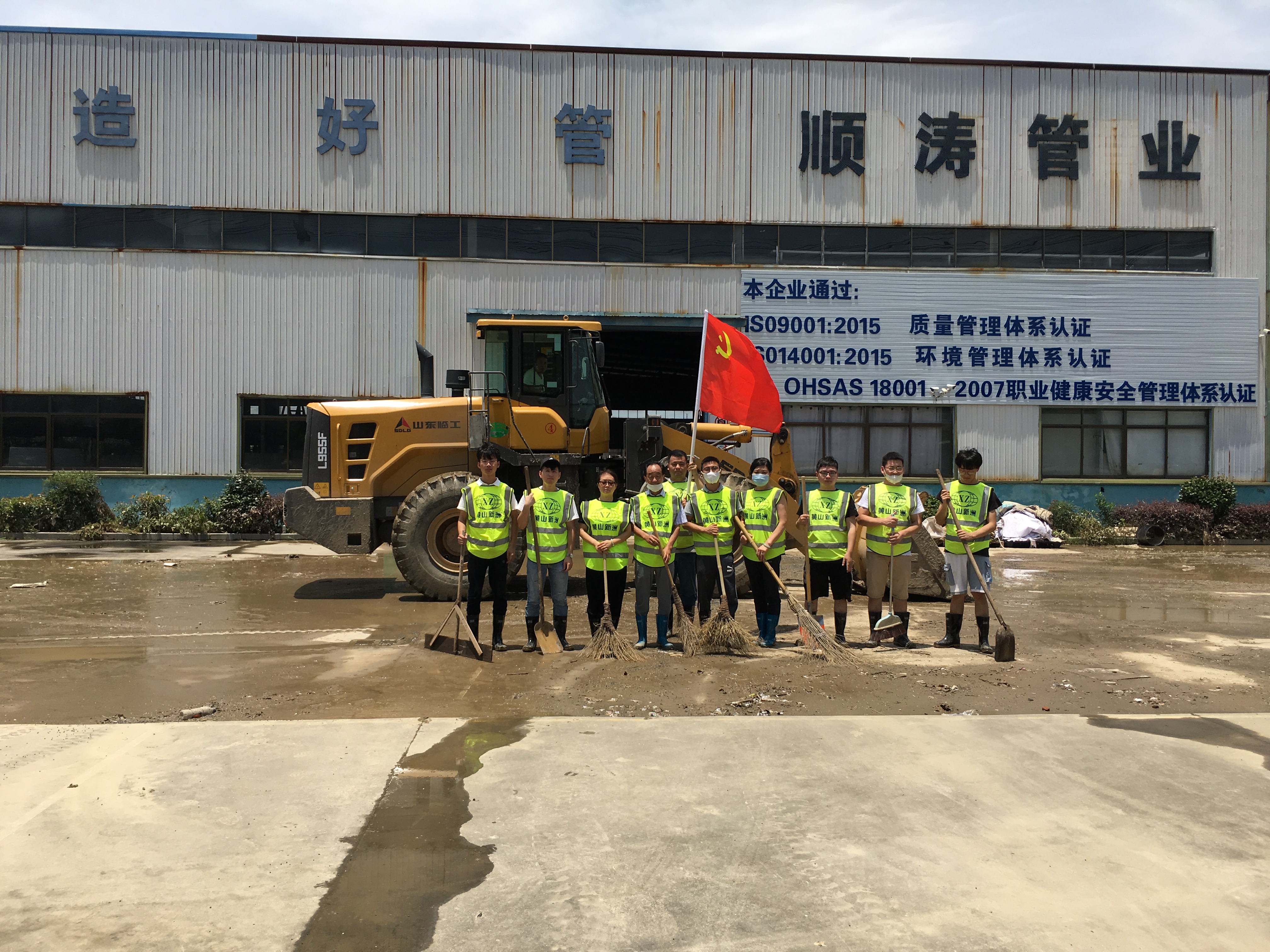 上午8時許,黃山新洲公司黨員、入黨積極分子、抗洪搶險志愿者開著鏟車、灑水車從屯溪區(qū)出發(fā)到達歙縣經(jīng)開區(qū)受澇嚴重的黃山順濤管業(yè)有限公司進行衛(wèi)生清掃,先清理垃圾及淤泥,再進行集中消毒消殺。烈日炎炎,新洲支部的黨員志愿者們個個不怕臟,不怕累,頂著烈日,揮汗如雨。通過一個上午的勞動,在人機配合下,掃除了垃圾,清除了表面泥土,受災企業(yè)的工作環(huán)境煥然一新。