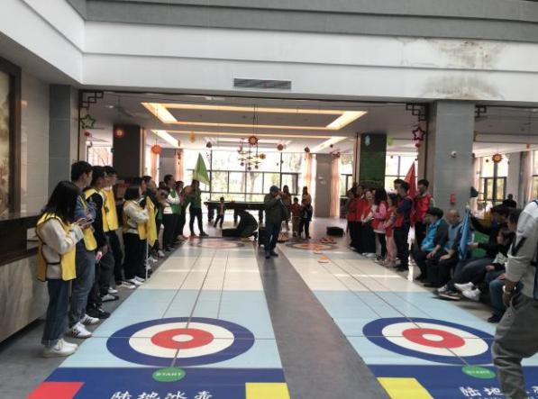 最后一個項目“旱地冰壺”,以小組為單位,在平滑的地面上進行投擲的競賽項目。通過讓自己的壺停放在預設好的位置,或將對方球擊出,達到制勝的目的。這項競賽集智慧、戰(zhàn)術、判斷、技巧、把握時機的能力為一體,充分發(fā)揚了雙方隊員誠實信任的體育精神。